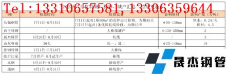 7月份無縫鋼管廠家出廠價格大幅下調。無縫鋼管廠家盈利情況仍不理想,整體厚壁鋼管出庫困難,無縫鋼管廠家多以虧損為主,在資金壓力較大情況下,有意打壓原料價格,當前無縫鋼管廠家對原料的采購積極性一般。近期無縫鋼管廠家考慮到廠庫居高不下,成本明顯虧損的情況下,各無縫鋼管廠家紛紛安排檢修減產,具體檢修情況如下: