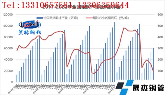 圖1 2017-2022年全國(guó)粗鋼產(chǎn)量及噸鋼利潤(rùn)